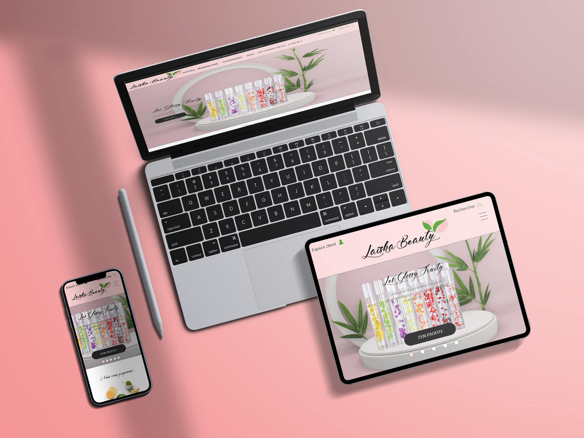J’ai utilisé le rose qui était déjà présent et que la cliente souhaitait garder, associé au vert qui apporte un côté nature en rapport avec sa gamme de cosmétique.